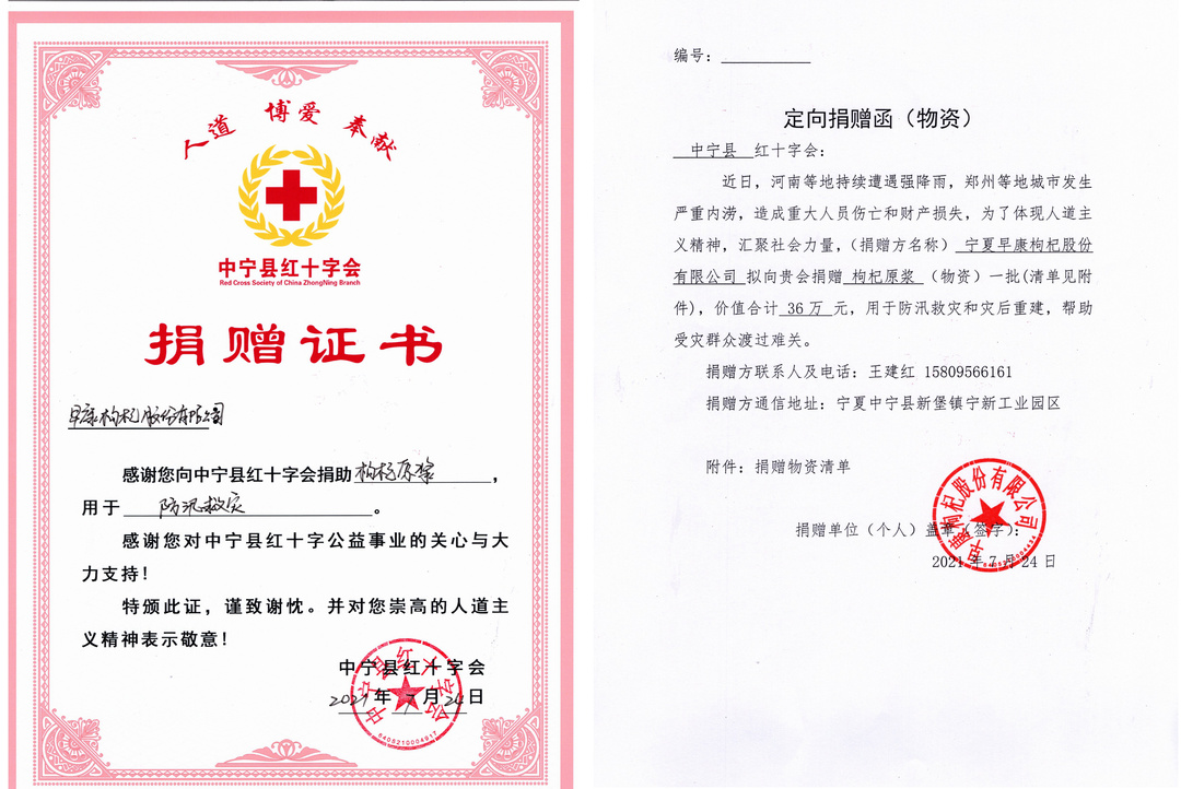 為馳援河南人民對抗暴雨災(zāi)害,7月24日,早康枸杞向中寧縣紅十字會捐贈價值36萬元物資,用于防汛救災(zāi)和災(zāi)后重建。