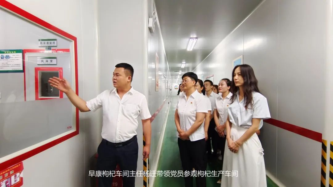 早康車間主任楊遷帶領(lǐng)黨員參觀枸杞生產(chǎn)車間